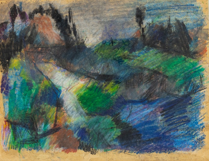 Renato Birolli, Pastello a cera su carta, 28,5x37 cm, Senza titolo (Composizione), 1956; Certificato di autenticità su foto Archivio Renato Birolli n. P1956-74