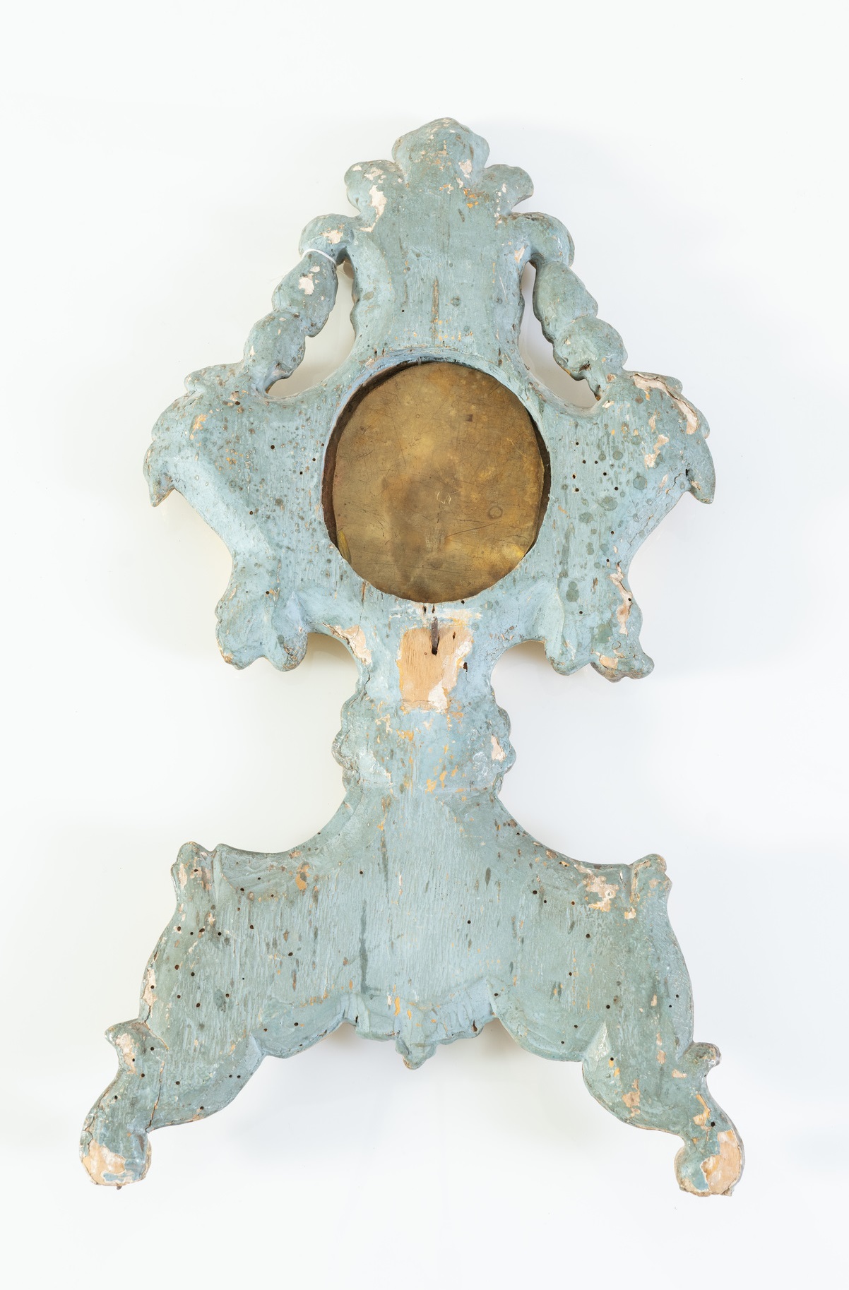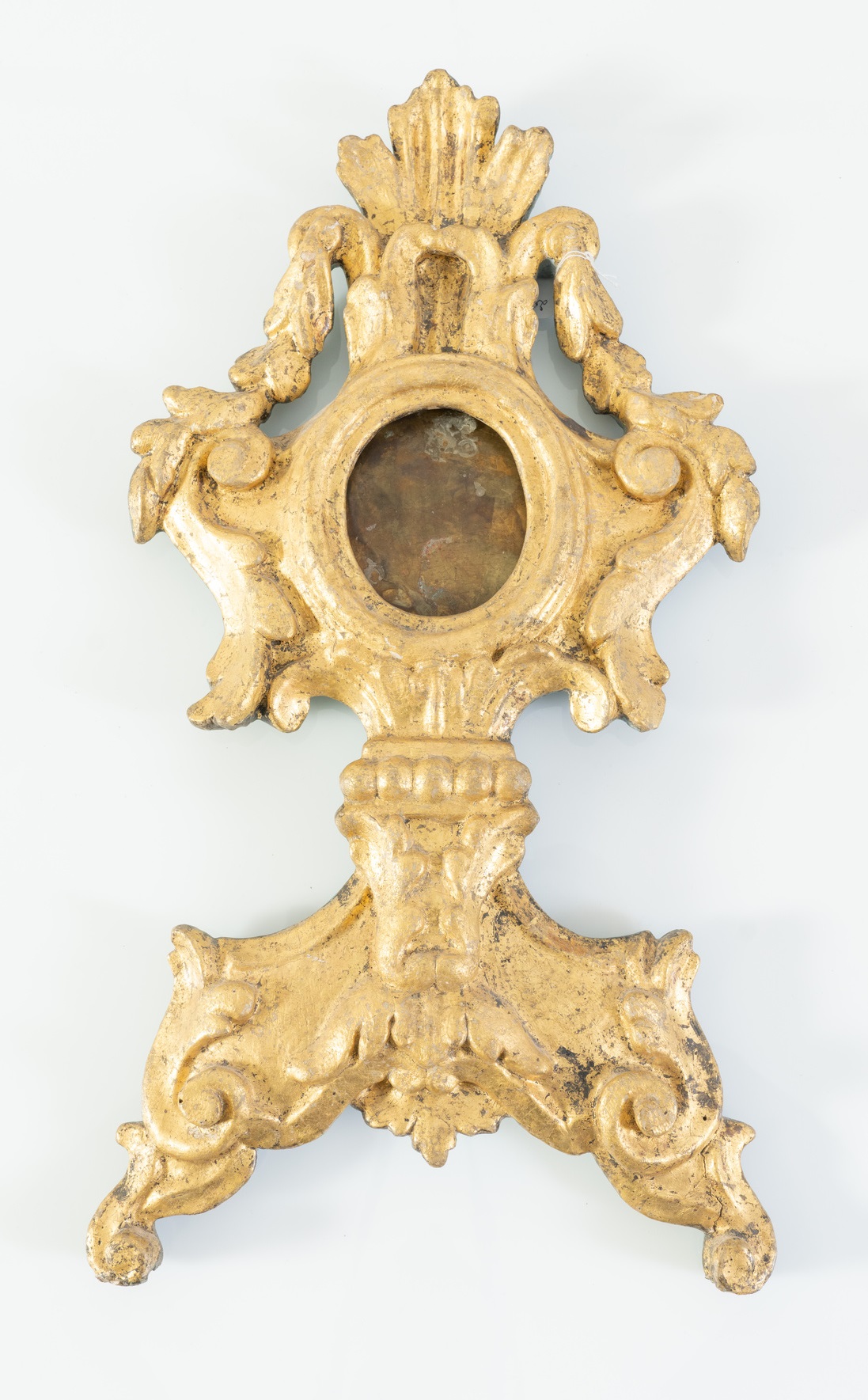 Manifattura italiana, XVIII-XIX secolo. Reliquiario a ostensorio in legno scolpito e dorato. La base si innalza su due pieducci a ricciolo e regge il fusto a foglie d'acanto e perline. Il ricettacolo a luce ovale è incorniciato da volute e coronato da una cimasa a palmetta con festoni ricadenti ai lati. Lievi difetti. Cm. 45x23.