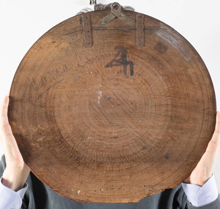 Jacques Courtois detto il Borgognone (Saint-Hyppolite 1621 - Roma 1676). Scena di battaglia. Olio su legno (rovere). Tondo lavorato al tornio in unico blocco con il supporto. Altezza cm. 3. Pittura diametro cm. 22,5. Diametro cm. 39,2. Probabilmente n. 3 facente parte di una serie di quattro. Lotto en suite al precedente. Perizia Gilberto Ganzer.Perizia Renato Portolan, Centro Restauro Pordenone.