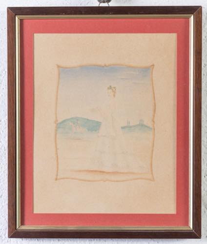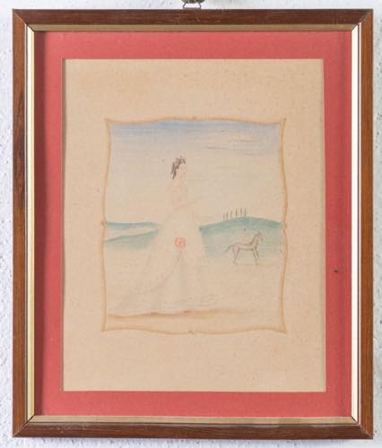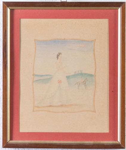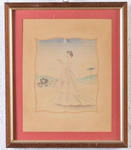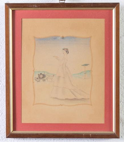 Lotto composto da 3 quadretti, XIX-XX secolo. Tecnica mista su carta. Raffiguranti dame con sfondo di paesaggi e scene di vita di corte. Ciascuno cm. 28,5x24.
