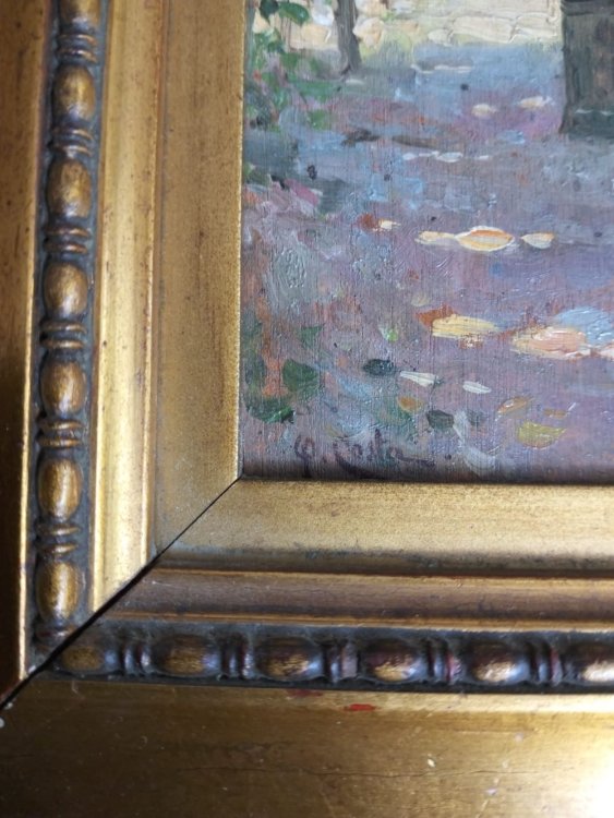 Giovanni (Nino) Costa (Roma 1826 – Marina di Pisa 1903). Veduta di un parco. Olio su tavola. Firmato in basso a sinistra G. Costa. Al verso è presente iscrizione. Cm. 19,5x13.