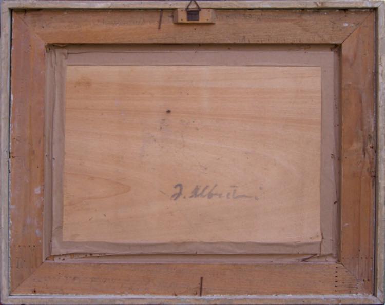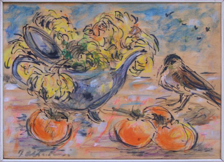 Filippo Albertoni (Reggio Emilia 1930 - Bologna 2011). Natura morta con rondine. Olio su compensato. Firmato in basso a sinistra F. Albertoni. Al verso firmato F. Albertoni. Cm. 28,5x38. Entro cornice.