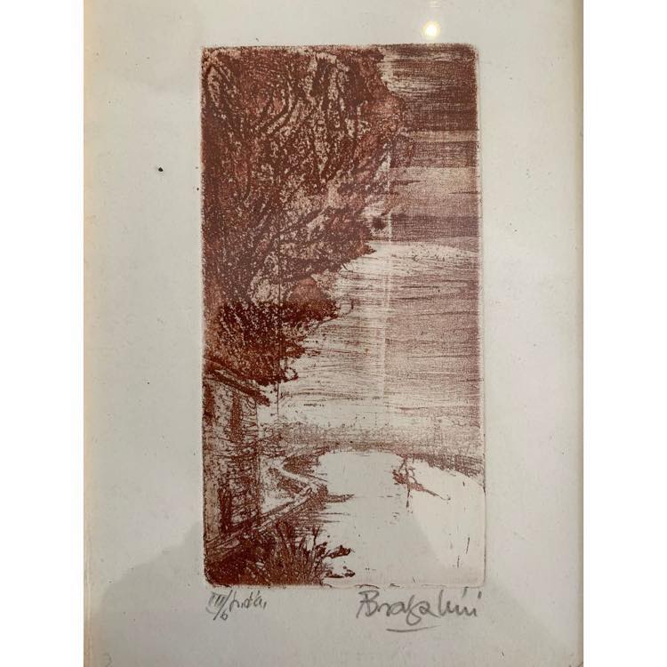 Angelo Bragalini (Fidenza 1913 - Bologna 1994). Paesaggio fluviale. Incisione. P.d'a. III/6. Firmato in basso a destra ABragalini. Cm. 12,5x6,5. In cornice cm. 20x15.