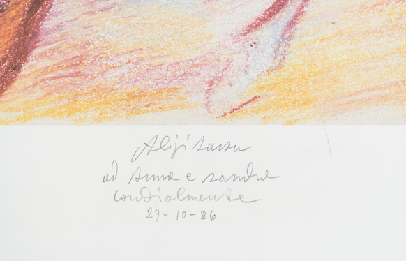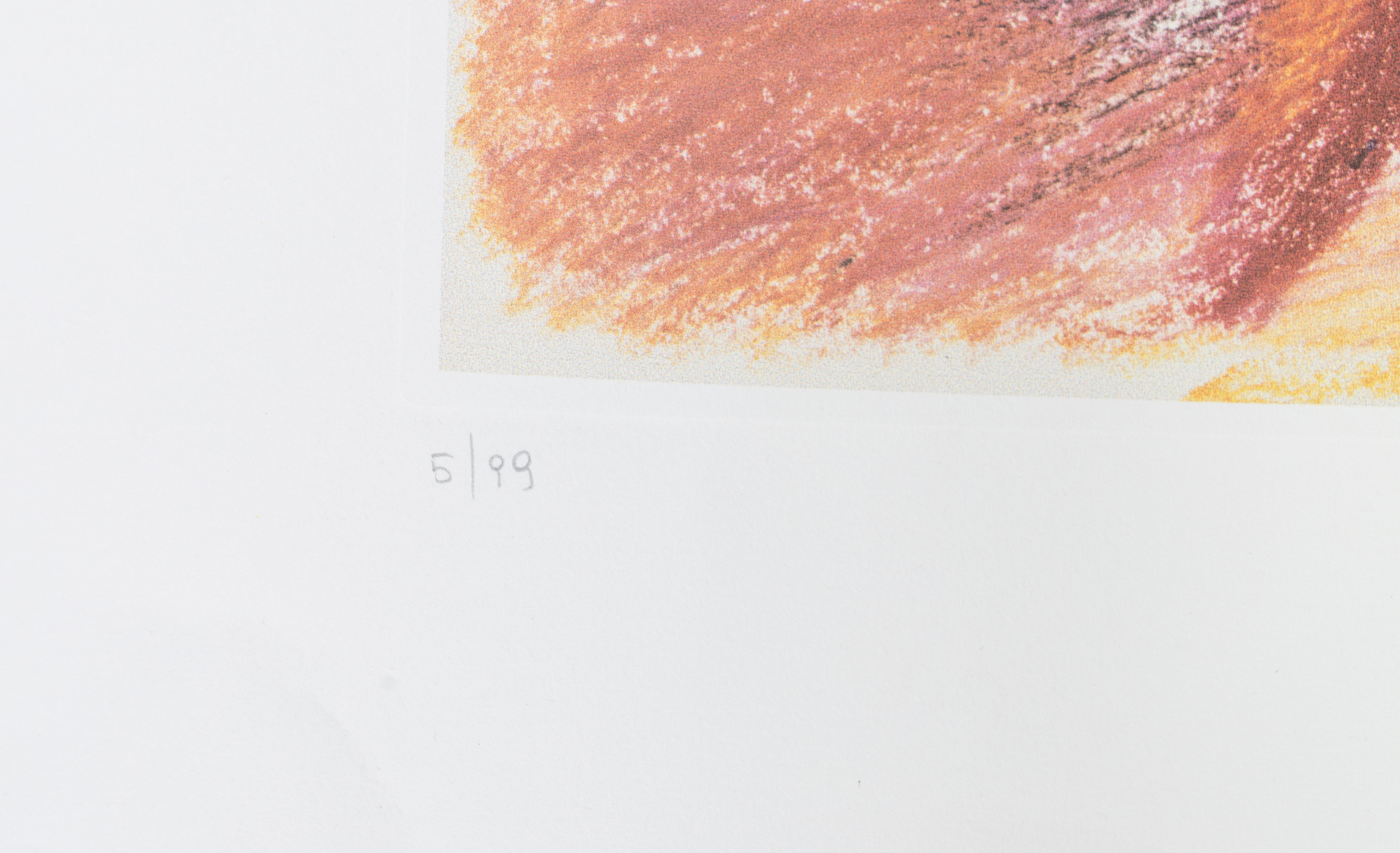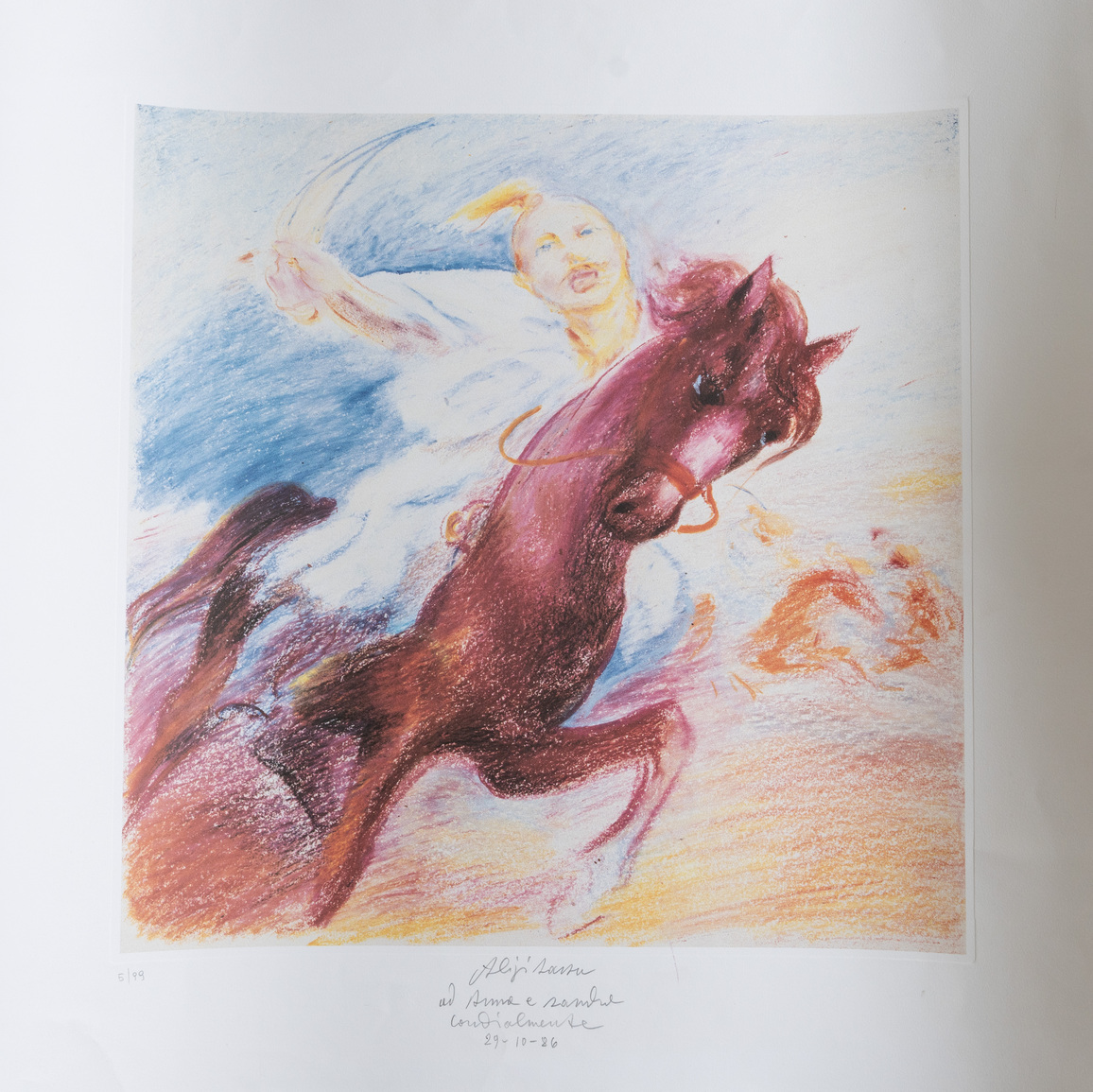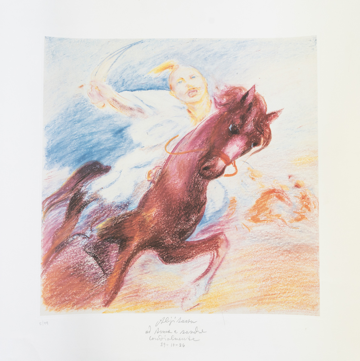 Aligi Sassu (Milano 1912 - Pollença 2000). Figura a cavallo. Multiplo a colori su carta. Esemplare n. 5/99, con dedica e firma dell'autore in basso al centro. Matrice cm. 51x51. Foglio cm. 67,5x68.