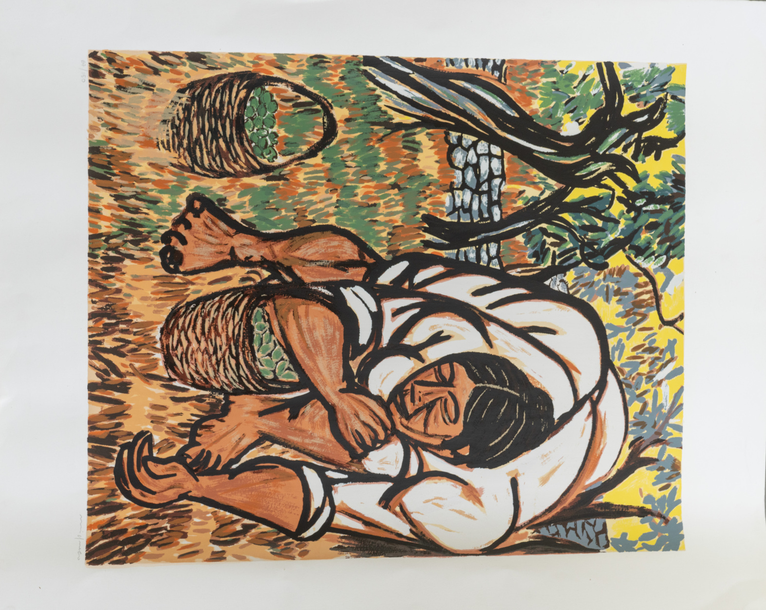 Giuseppe Migneco (Messina 1903 - Milano 1997). Raccoglitrice di olive. Multiplo a colori su carta. Esemplare n. 67/150. Firmato in basso a destra. Foglio cm. 80x64,5