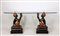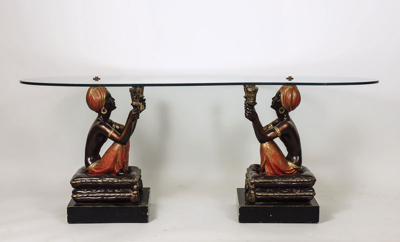 TAVOLINO BASSO DA APPOGGIO - WOOD AND CRYSTAL COFFEE TABLE piano a fagiolo in cristallo sorretto da due figure lignee policrome realizzate come due indiani con cappelli a turbante seduti a gambe incrociate, difetti h cm 54x137x71