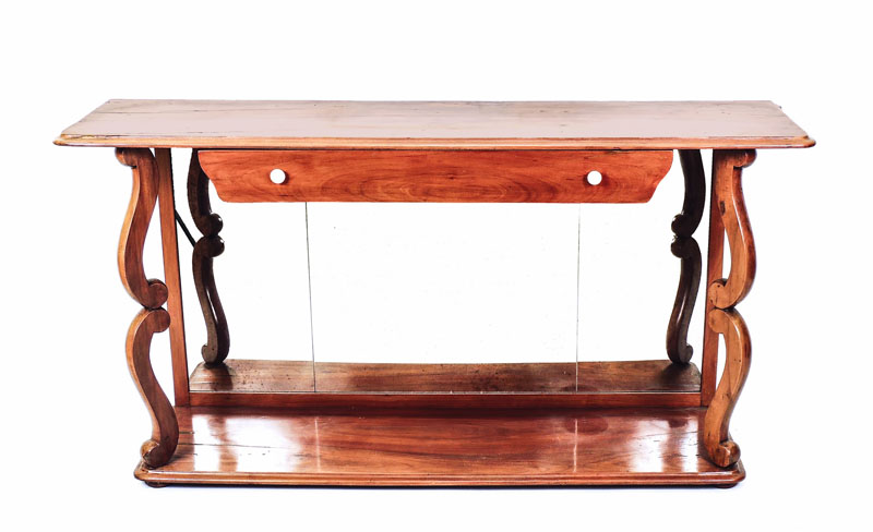 CONSOLE IN MOGANO BIONDO - BLONDE MAHOGANY CONSOLE un cassetto nella fascia, sostegni mossi con fondo a specchio h cm 75,5x148x37