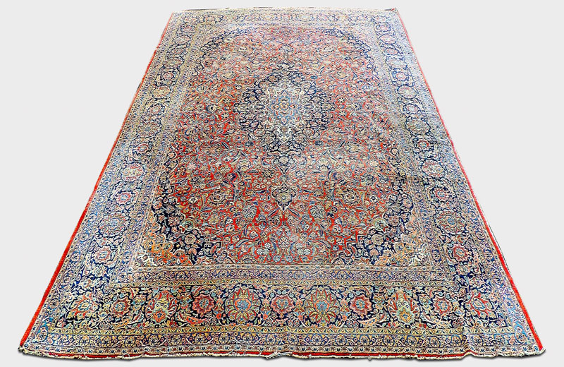 TAPPETO PERSIANO KIRMAN - PERSIAN KIRMAN CARPET fondo rosso, campo a motivi floreali nei toni del blu e dell'avorio, lievi difetti cm 344x415