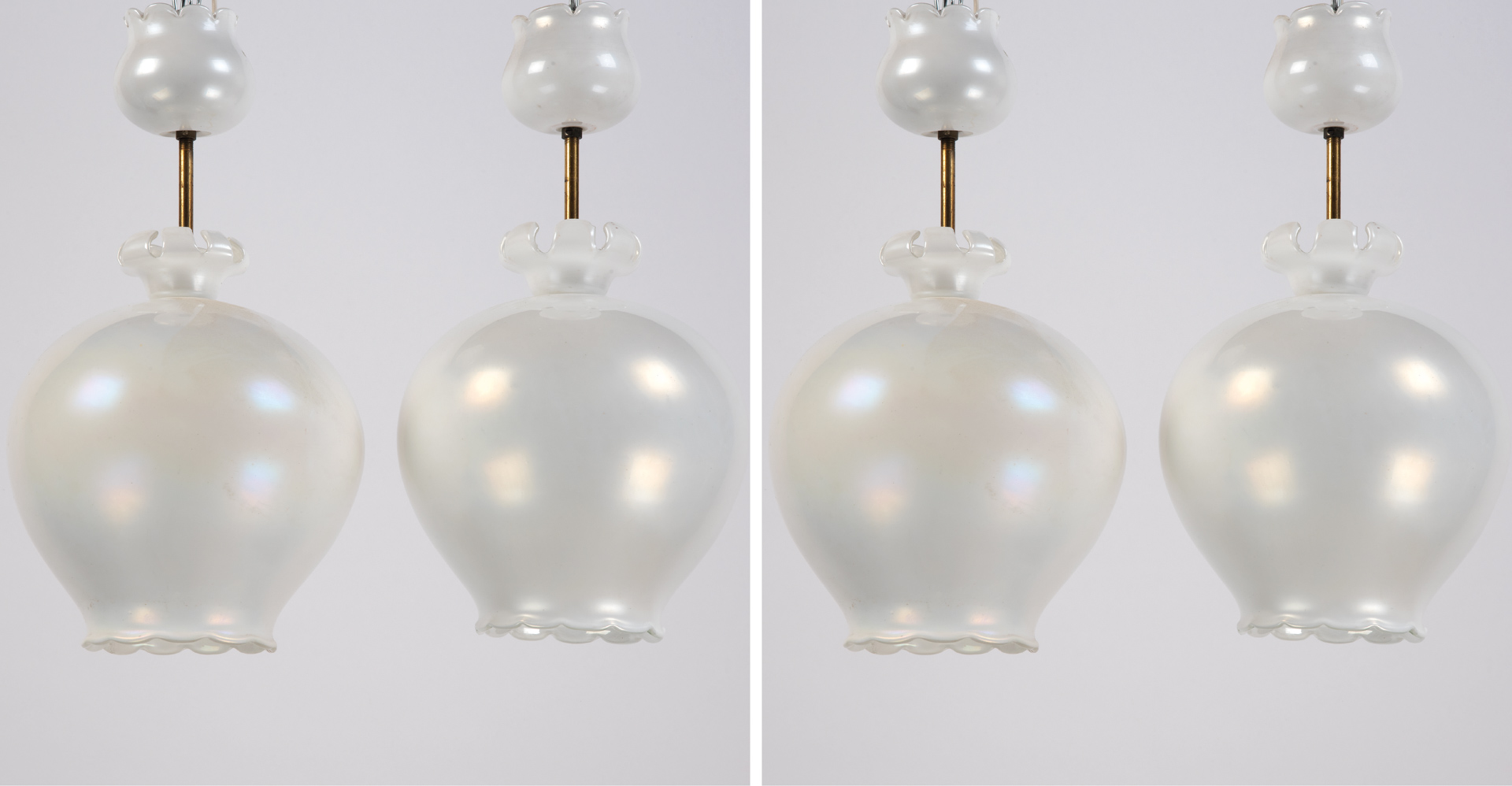 Vetreria Gino Cenedese Murano 4 lampadari a sospensione Hotel Bristol Merano,1953/1954;Tipo "Melograno" in vetro bianco lattimo iridato,