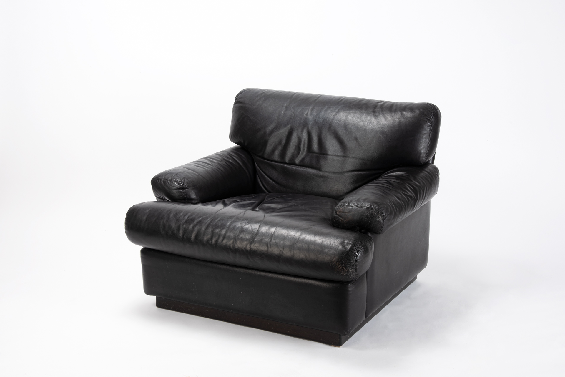 Vico Magistretti Poltrona modello 928, 1961;Base in faggio tinto e rivestimento in pelle nera, 82 x 95 x 70 cm, produzione Cassina, segni d’uso