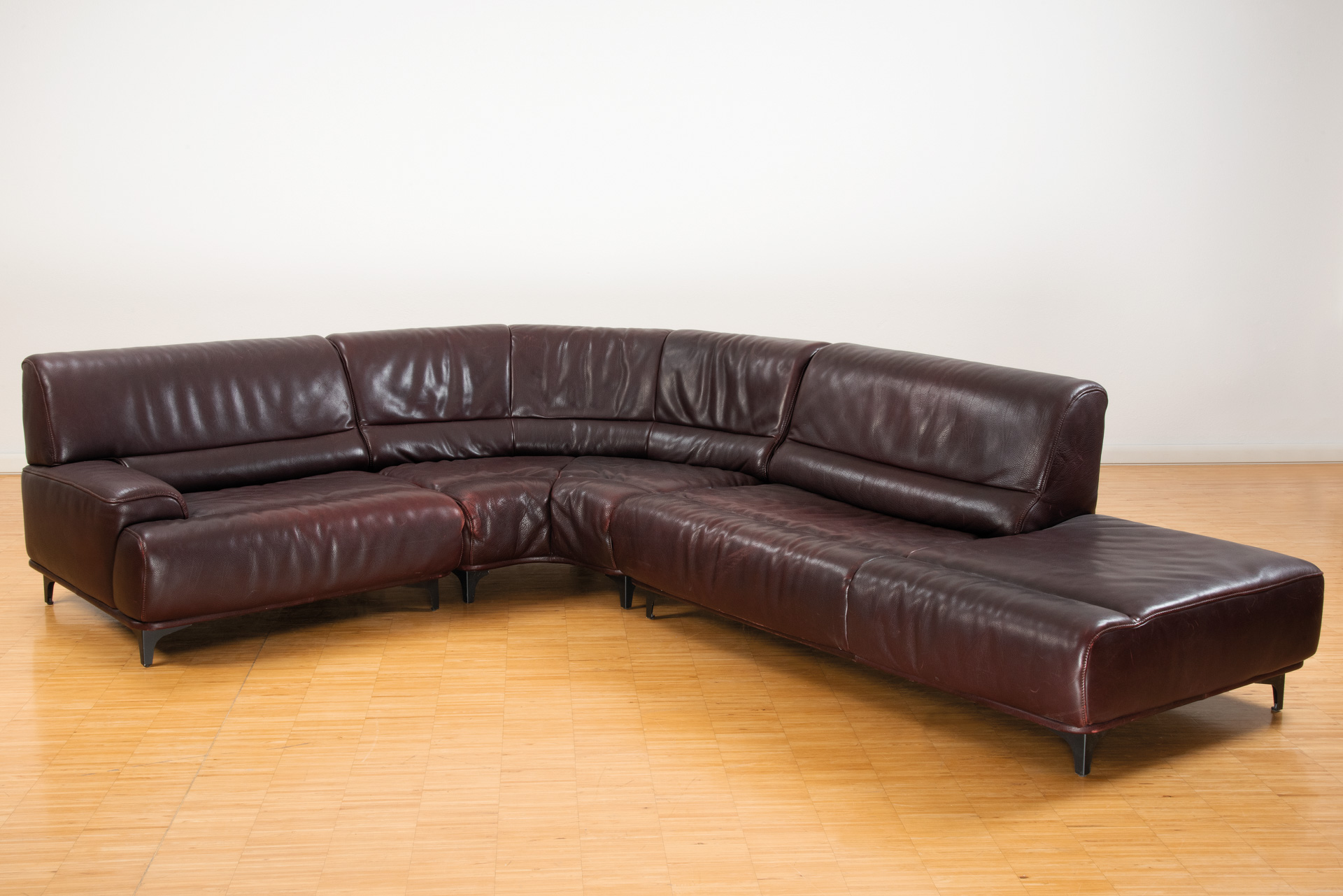 DE SEDE Divano Modello DS-18, Anni ‘80;Composto da tre moduli, in pelle marrone, larghezza 280 cm , profondità 215 cm, h. 73 cm, a disposizione i piedini originali in legno, segni del tempo sulla seduta, alla base etichetta De Sede