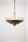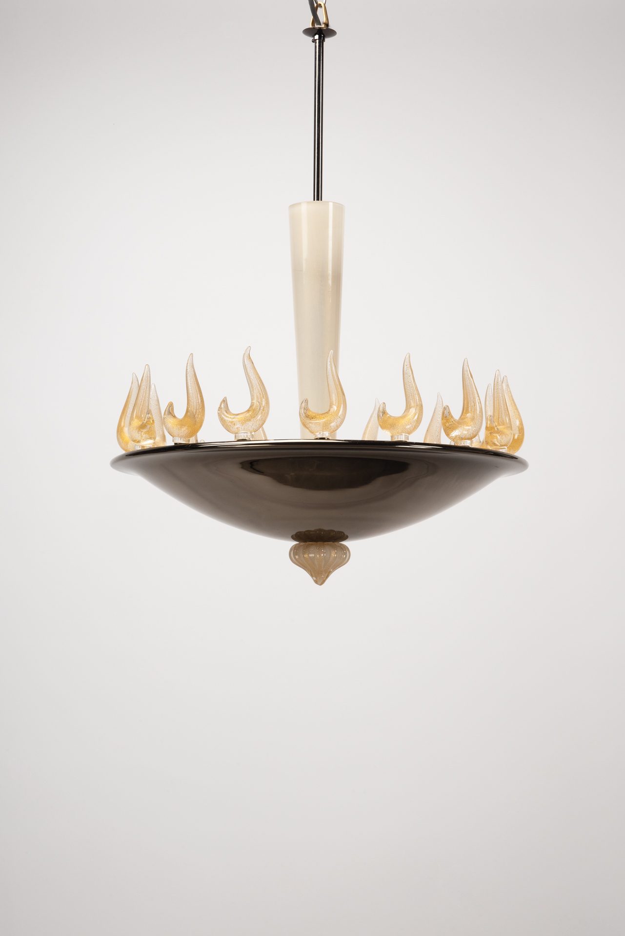 Marco Mencacci Lampadario a sospensione Modello "Elio", Anni ‘90;Vetro di murano scuro, inserti in vetro dorato, rosone e finale, h. 55-80 cm,