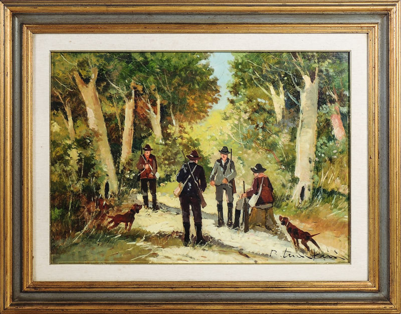 RENZO MARTINI (1937-2005) Cacciatori - Hunters olio su faesite - oil on faesite, firmato, al verso firmato, in cornice cm 50x70