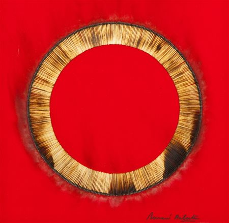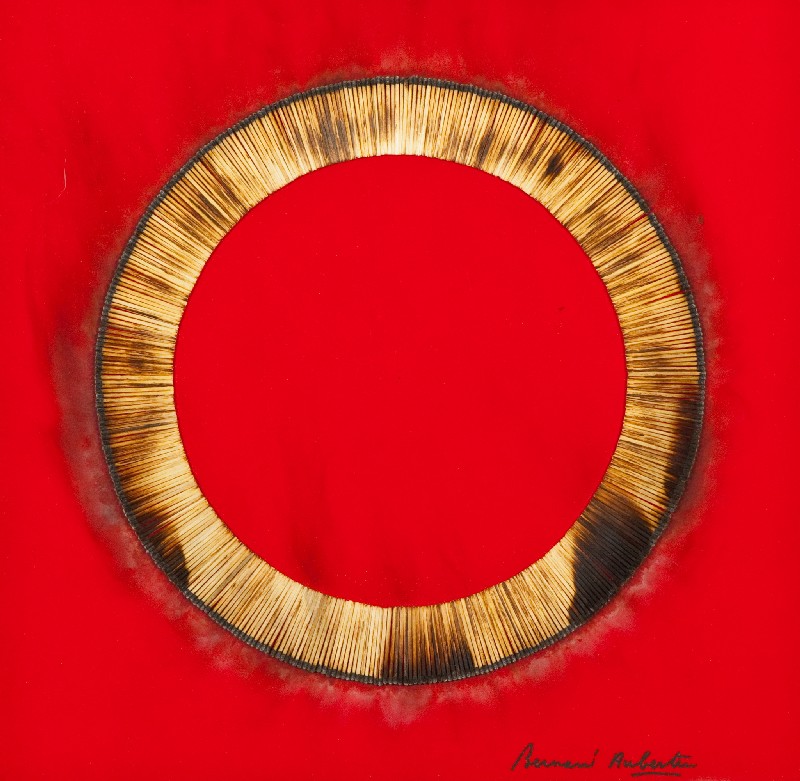 Bernard Aubertin (Fotenay aux Roses 1934) DESSIN DE FEU, 2000 Fiammiferi bruciati su tavola dipinta, cm. 50x50 Firmato in basso a destra. Sul verso: etichetta "Civico Museo Parisi - Vale Mascagno, Varese - Bernard Aubertin Territori di Fuoco, 15 Maggio 3 Luglio, 2011"; Timbro "Galleria d'Arte Rosemberg", Milano. Esposizione: Civico Museo Parisi - Valle, Maccagno, Varese - "Bernard Aubertin Territori di Fuoco", 15 Maggio 3 Luglio, 2011, pubblicato sul catalogo pag. 78 - 79. Autentica dell'Artista su foto.