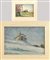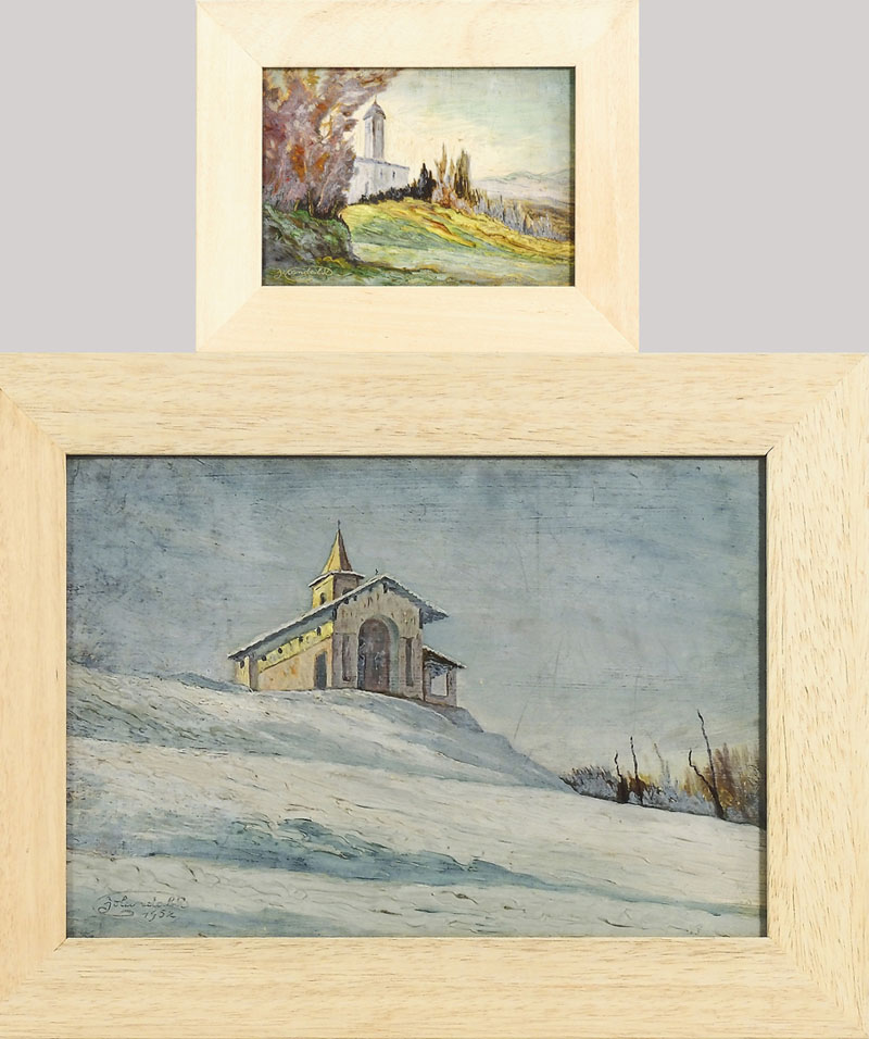 PAESAGGIO INNEVATO E PAESAGGIO CON VEDUTA DI CHIESA - SNOWY LANDSCAPE AND LANDSCAPE WITH CHURCH VIEW due dipinti ad olio su cartone - two oils on cardboad, firmati, uno datato 1952, in cornice cm 25x36 e cm 18x25 (2)