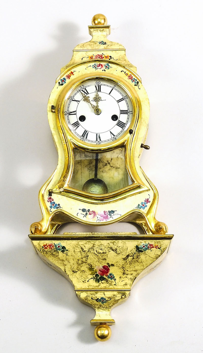 OROLOGIO A PENDOLO D'EPOCA IN LEGNO LACCATO E DIPINTO - OLD LACQUERED AND PAINTED WOODEN PENDULUM CLOCK corpo sagomato, quadrante con numeri romani, decorazione floreale con lumeggiature oro, piedini mossi, corredato di mensolina en pendant, funzionante h cm 50 (2)