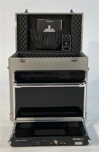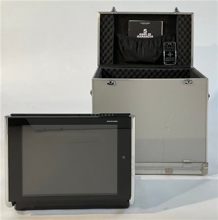 Televisore modello "Alpha 312". Produzione Brionvega, Italia, 2008. Struttura composta da due elementi rivestiti in nero, uniti da un telaio in tubo cromato. LCD con lettore DVD integrato. Completo di scatola originale. (cm 52x42,5x24)