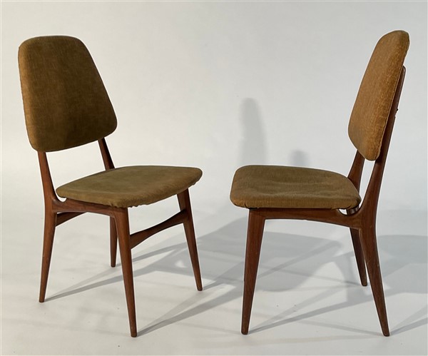 Coppia di sedie in legno con schienale e seduta rivestiti in tessuto beige. Italia, anni '50. (cm 44x93x50) (lievi difetti)