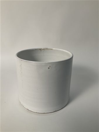 Vaso cilindrico in terracotta smaltata in bianco. Firmato sotto la base. (cm 16x14,5) (lievi difetti)