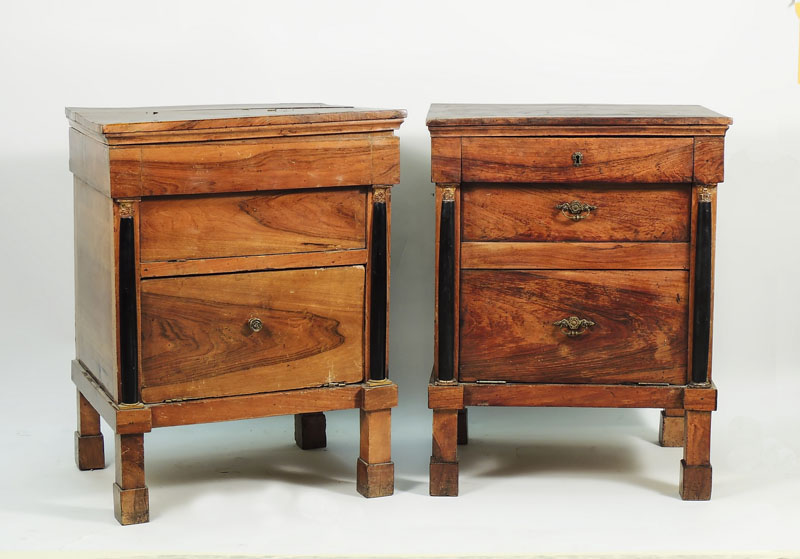 COPPIA DI COMODINI A COMODA IMPIALLACCIATI IN NOCE - PAIR OF WALNUT VENEERED NIGHT TABLES inizio del XIX secolo - early 19th Century fronte dritto con finti cassetti, lesene a colonna ebanizzata, piedi a plinto, difetti h cm 74,5x57,5x44,5