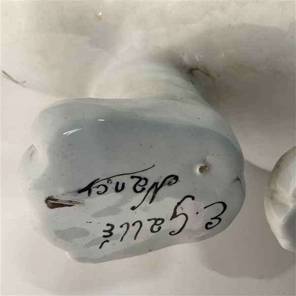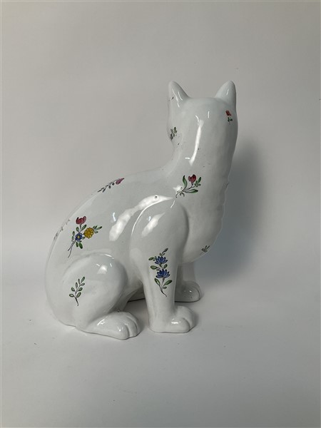 Scultura raffigurante gatto in ceramica bianca con decori policromi, occhi in pasta vitrea firmata Gallé (h cm 31). Francia, secolo XX.