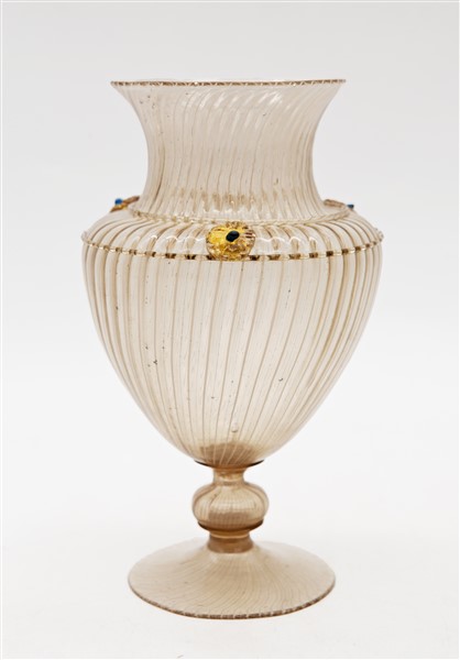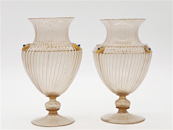 Manifattura di Murano Coppia di vasi in vetro soffiato pagliesco trasparente e c