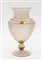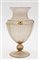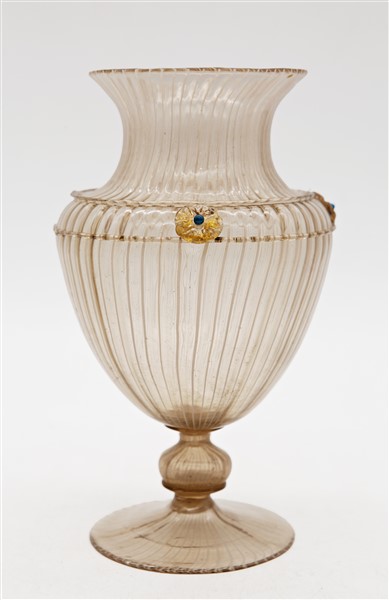 Coppia di vasi in vetro soffiato pagliesco trasparente e canne lattimo decorato da fiori in vetro soffiato trasparente blu con foglia d'oro applicati a caldo nella circonferenza del corpo. Anni '40. (h cm 21,5) (lievi difetti)
