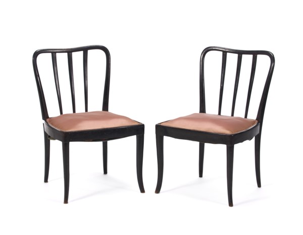 Coppia di sedie da camera in legno massello ebanizzato, seduta imbottita e rivestita in seta. Italia, anni '40. (cm 49x79x50) (difetti)
