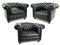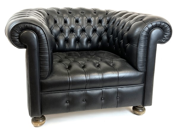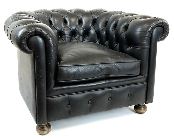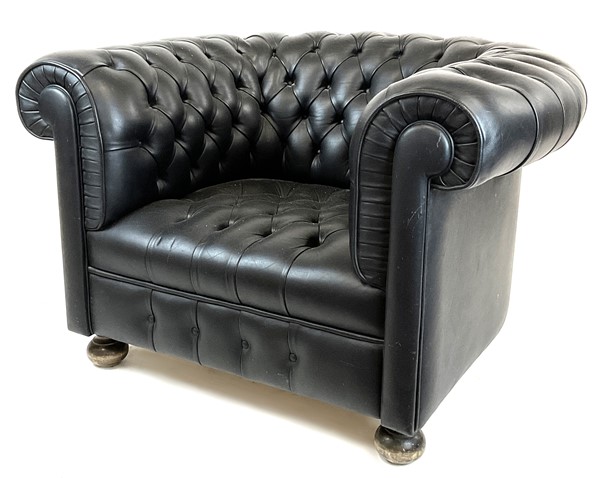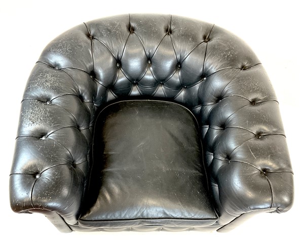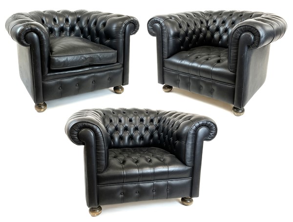 Coppia di poltrone capitonné unite ad una di simile fattura. Italia, anni '80/'90. Rivestimento in pelle nera. (cm max 110x71x100) (difetti)