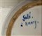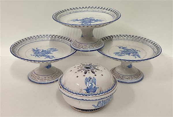 Gallè à Nancy. Lotto composto da tre alzatine e una biscottiera con coperchio traforato in ceramica smaltata in bianco con decori monocromi blu sottovetrina. Nancy, fine secolo XIX/inizio secolo XX. (cm max 24x11,5) (difetti)