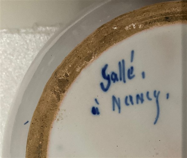 Gallè à Nancy. Lotto composto da tre alzatine e una biscottiera con coperchio t