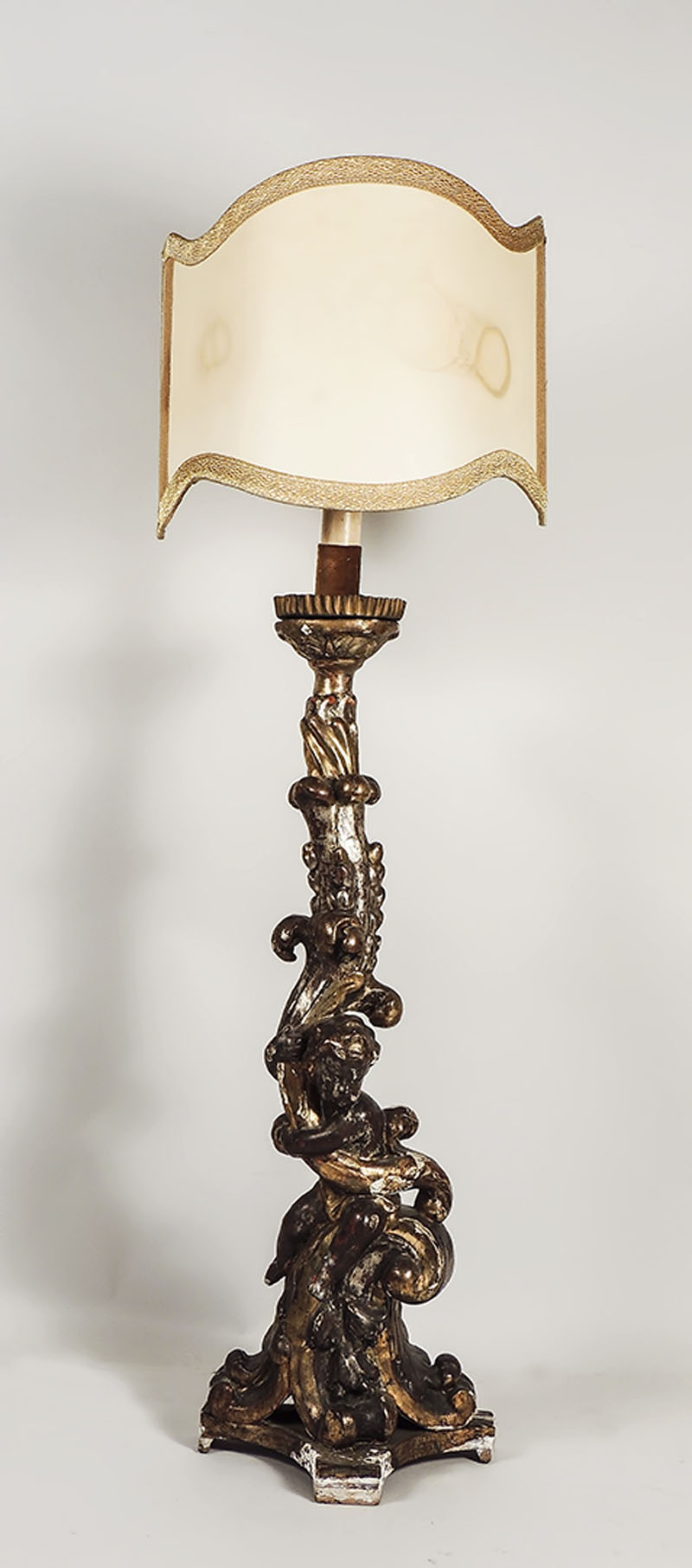 TORCIERA IN LEGNO INTAGLIATO, DORATO E IN PARTE DIPINTO - GILTWOOD AND PARTIALLY PAINTED PRICKET fine del XVIII secolo - late 18th Century realizzata come un putto che sorregge una cornucopia, base a tripode, lievi difetti alla doratura h cm 88