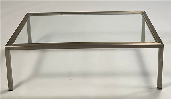 Due tavoli bassi in acciaio aisi e metallo ottonato. Piani in vetro. Italia, anni '80/'90. (difetti)