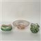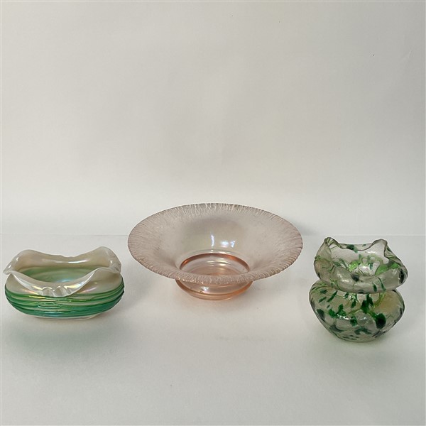 Lotto composto da una coppa in vetro rosa trasparente fortemente iridato, un vaso a sezione ovoidale in vetro opaco bianco con applicazioni in vetro verde fortemente iridati e un vasetto in vetro incolore e verde trasparente. Inizio secolo XX. (d max cm 26) (rotture e gravi difetti al vaso verde)