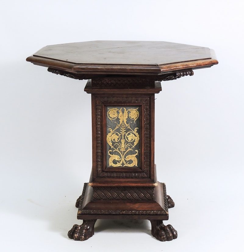 TAVOLINO OTTAGONALE IN NOCE - OCTAGONAL WALNUT TABLE inizio del XX secolo - early 20th Century sostegno centrale con sportello intagliato con grottesche ed in parte dipinto nei toni del celeste, piedi a zampa leonina h cm 67x68x68