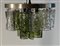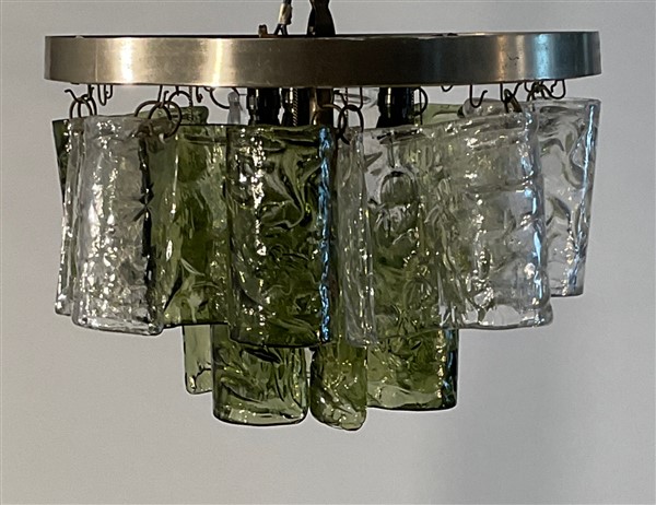 Lampada a sospensione circolare con pendenti. Italia, anni '70. Vetro verde trasparente e incolore corrugato da un lato.