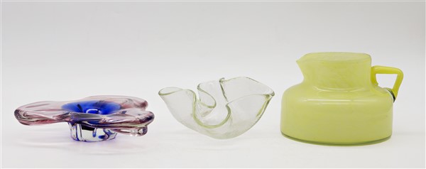 Manifattura di Murano Lotto composto da due centrotavola e una brocca in vetro.