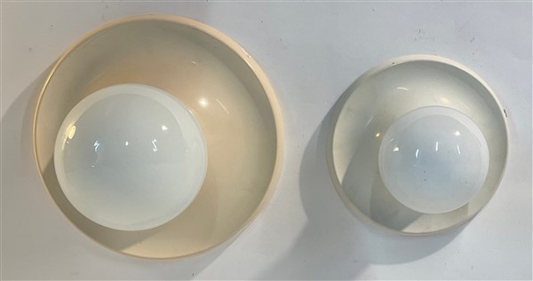 Due plafoniere modello "Light ball". Produzione Flos, Italia, 1965. Struttura in metallo smaltato bianco-avorio con diffusore sferico in vetro opalino. (h cm 24; d cm 32,5) (lievi difetti)