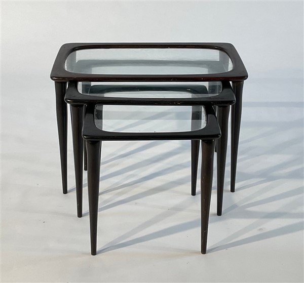 Lotto 815 | Tre tavolini a nido in legno tinto nero, piano in vetro e gambe rastremate cili