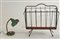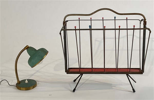 Lotto composto da un portariviste in metallo verniciato nero e cromato ed una lampada da tavolo in metallo smaltato verde e ottone. Italia, anni '60. Italia, anni '60. (difetti e mancanze)