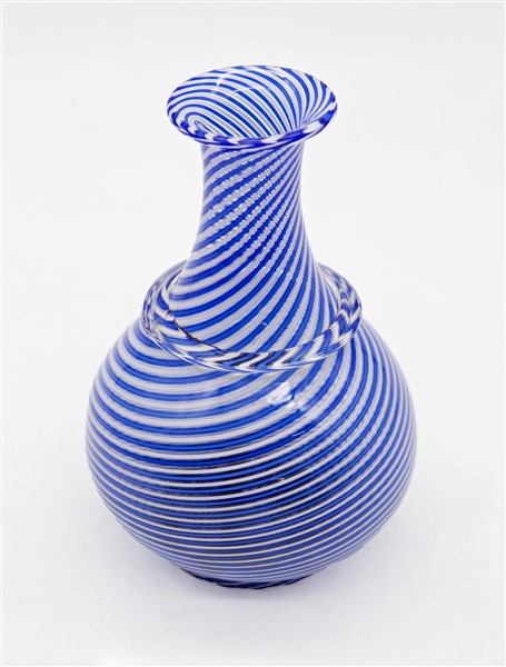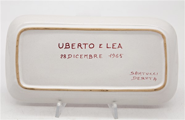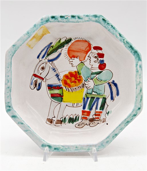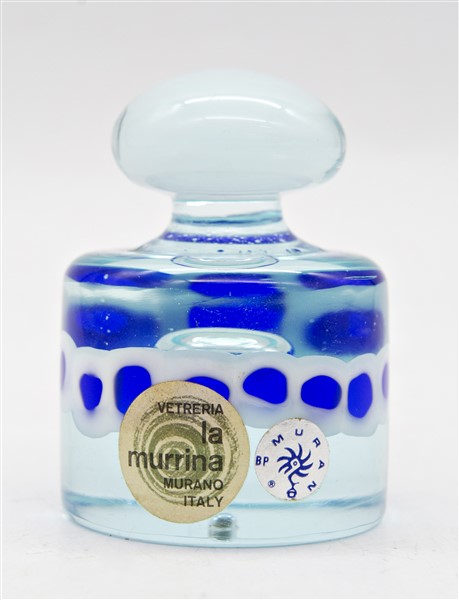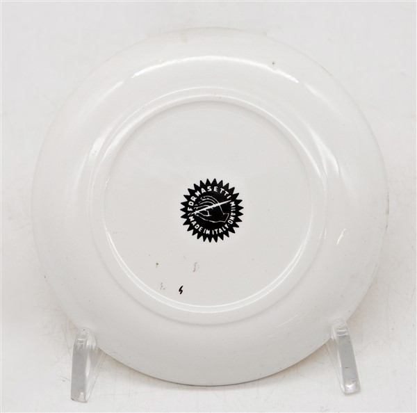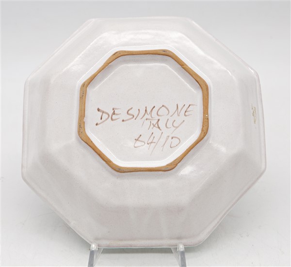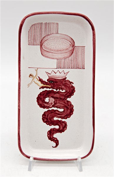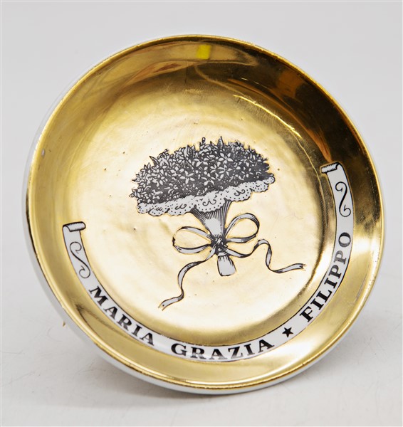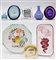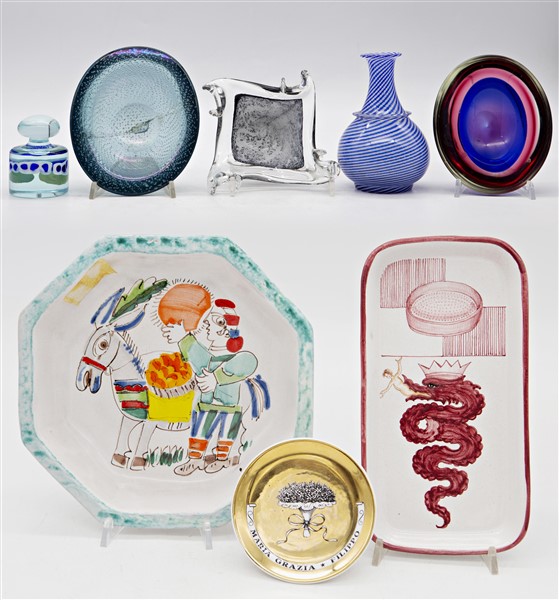Lotto composto da due posacenere, un centrotavola ed una bottiglia in vetro soffiato di Murano di diverso decoro, un presse-papier La Murrina, un piattino Fornasetti e due diversi piatti in terracotta smaltata. Italia, seconda metà secolo XX. (h max cm 15) (difetti e restauri)