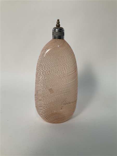 Bottiglia in vetro soffiato trasparente rosino a mezza filigrana lattimo. Anni '30/'40. (h cm 27)