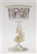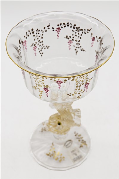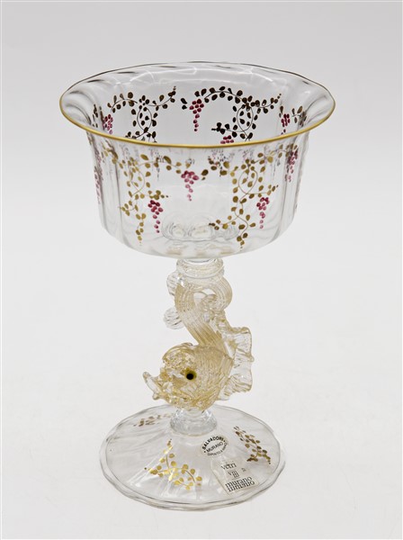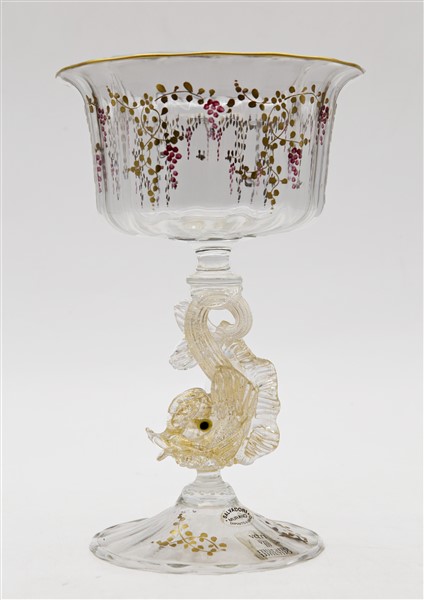 Coppa in vetro soffiato cristallo trasparente dipinto a mano a tralci d'uva dorati e ametista, sostegno a guisa di delfino a tutto tondo con inclusioni di foglia d'oro. Murano, seconda metà secolo XX. Firmato a incussione e recante etichetta della manifattura. (h cm 22,5)
