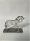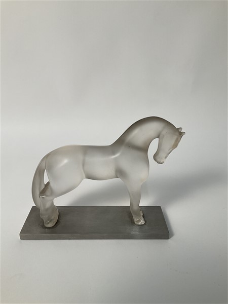 Scultura in vetro soffiato a stampo acidato sula superficie esterna raffigurante un cavallo incollato su base in metallo satinato. Francia, anni '80/'90. Firmato a punta. (cm 18x15x6) (difetti)