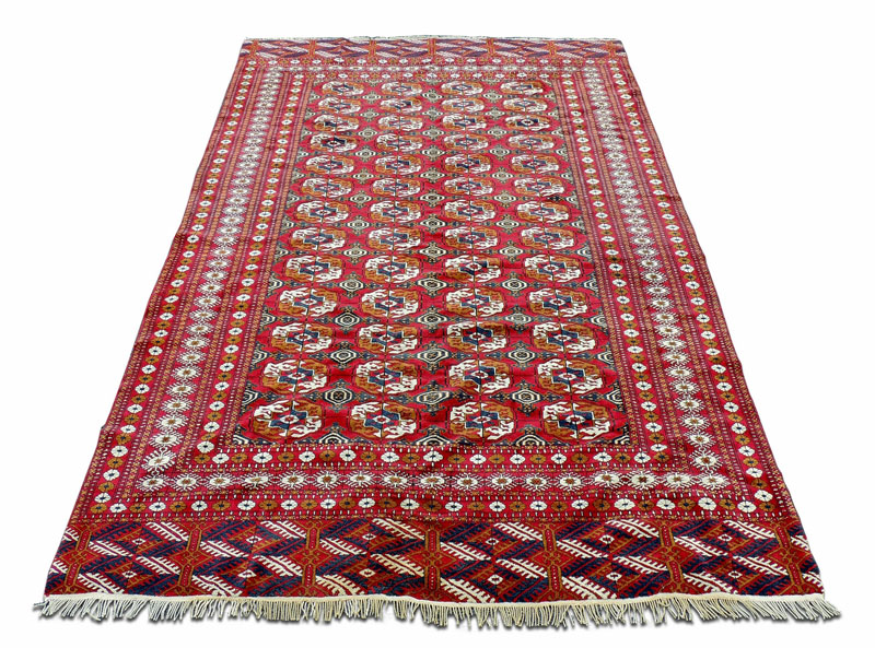 TAPPETO BUKARA - BUKARA RUG Russia, 1920 fondo rosso, campo con motivi geometrici, bordura nei toni dell'avorio e del blu cm 280x182