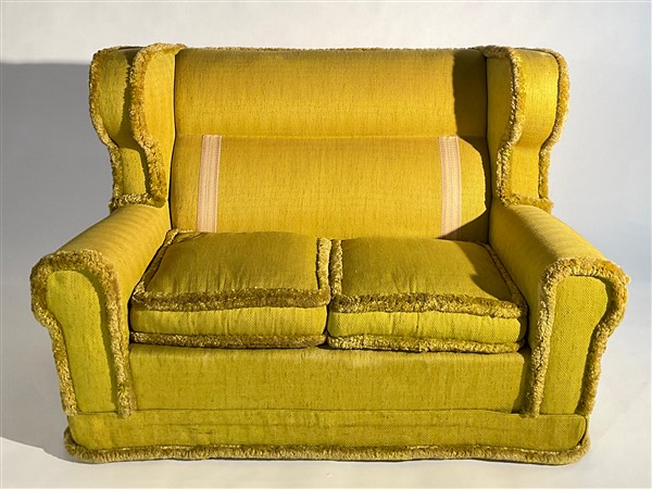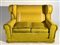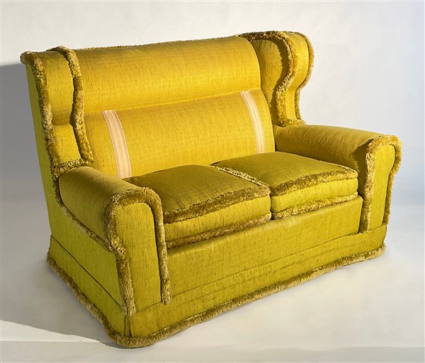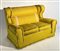 Coppia di divani a due posti con schienale a orecchioni, rivestiti in tessuto spigato giallo con bordure in velluto. Italia, anni '40/'50ca. (cm 154x98x92) (difetti)