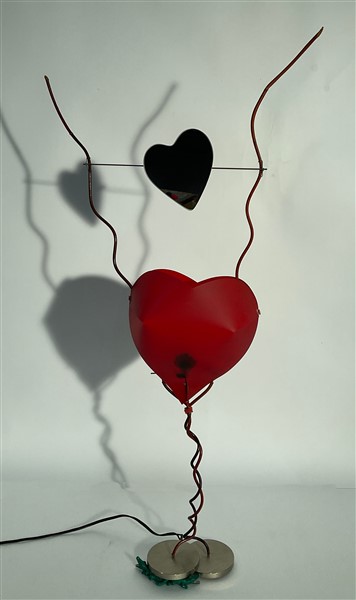 Lampada da tavolo modello "One From The Heart". Germania, 1980ca. Diffusore a forma di cuore in plastica rossa sormontato da uno specchietto orientabile a forma di cuore retroverniciato rosso. Struttura formata da due tubolari arancioni intrecciati. Base composta da due tondi in metallo da cui escono due coccodrilli con la bocca aperta. (h cm 87) (difetti)