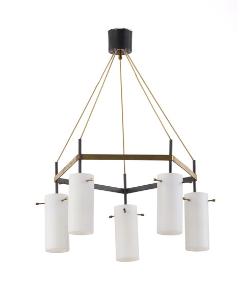 Lampadario in ottone e metallo verniciato nero, cinque diffusori cilindrici in vetro opalino. Italia, anni '60. (h cm 70; d cm 52) (lievi difetti)