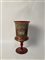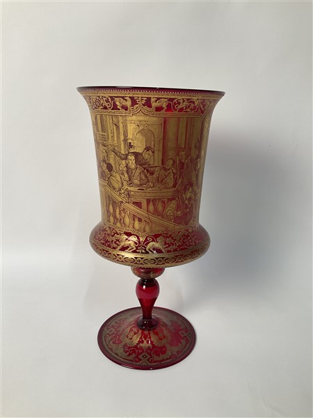 Grande vaso a calice in vetro soffiato trasparente rosso decorato in oro a grottesche e a smalti policromi con la riproduzione de "La cena in casa Levi" di Paolo Veronese (h. cm 42). Prima metà secolo XX. (lievi difetti)