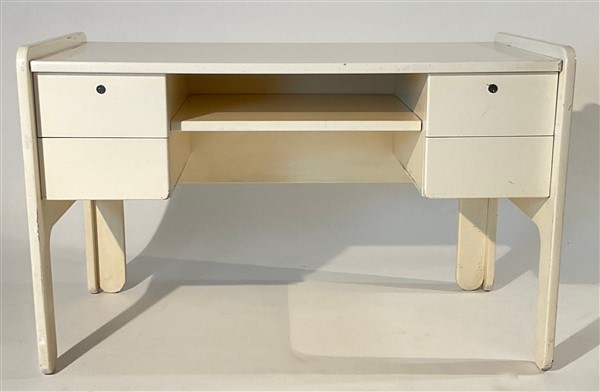 Scrivania in legno laccato bianco con due cassetti nei lati e uno scomparto sottopiano. Probabile produzione Alberto Bazzani, Bovisio (Mi), anni '70. (cm 125x80x65) (lievi difetti, mancanti delle chiavi)